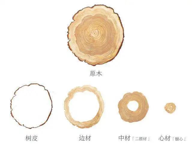 從樹木的橫截面或原木的端頭上觀察,(在宏觀上)可將木材分為4個部分:最外層為樹皮,最中心的部分為髓心(俗稱樹心),髓心周圍是心材,心材以外至樹皮的邊緣部分為邊材。