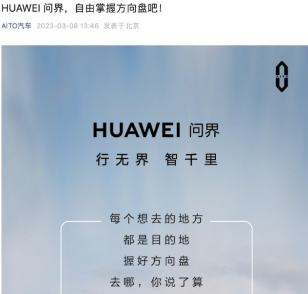 此前,問界系列汽車的品牌中僅出現“AITO”“問界”的標識,不過,今年3月8日,華為生態汽車品牌正式煥新為HUAWEI問界,AITO汽車在微博、微信等多個平臺的宣發中,首次使用了“HUAWEI問界”的全新標語。從此之后,幾乎所有華為線下門店的AITO汽車車身都貼上了“HUAWEI問界”的logo,線下渠道也在銷售時將此作為重點宣傳話術,以突出華為。
