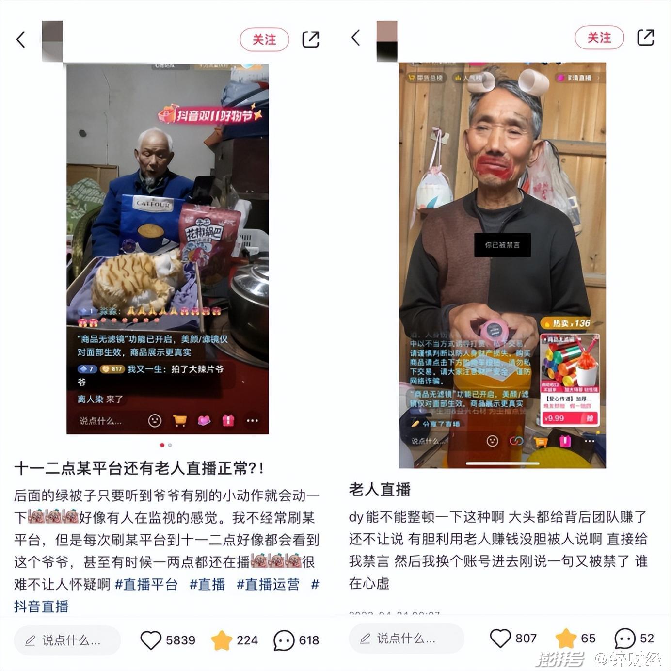 社交媒體上,有不少網(wǎng)友反映,曾在深夜刷到過(guò)老人帶貨直播間,但當(dāng)他們?cè)谠u(píng)論區(qū)質(zhì)疑“凌晨一兩點(diǎn)還讓老人直播合理嗎”“老人家是不是被監(jiān)視”“這么累了為什么一直站著不能下播”時(shí),就會(huì)立刻被禁言或踢出直播間。