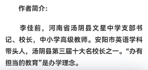 網友們扒拉了一下,發現該小說的作者名叫“李佳前”,是河南省湯陰縣文星中學支部書記,被評選過“湯陰縣第三屆十大名校長之一”。說實話,這個名頭有點太低了。如果不是這篇小說被選入成都新都區初三年級語文測試,可能沒幾個人會認識他。在一個常規縣,都不一定能湊出十所中學,而李佳前被評為湯陰縣十大名校長,這完全就是一個虛假的榮譽。