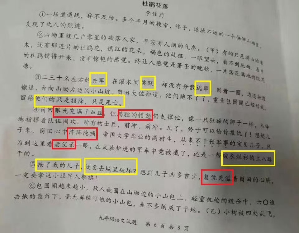 在成都新都區初三年級語文測試中,出現了一篇觸目驚心的文章,名叫《杜鵑花落》。看題目,不會覺得有啥。但是,結合文章內容,這“杜鵑花”就另有所指了。