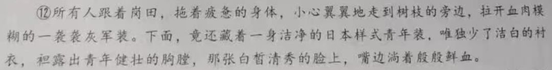 日軍是什么形象呢?文章的大佐兒子是這么被描述的:“下面竟還藏著一身潔凈的日本樣式青年裝,唯獨少了潔白的襯衣,袒露出青年健壯的胸膛,那張白皙清秀的臉上,嘴邊淌著汩汩鮮血。”